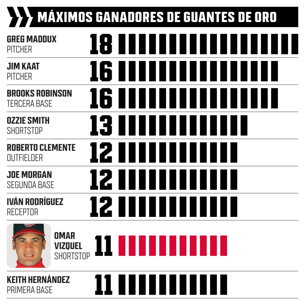 Los 11 Guantes de Oro de Omar lo colocan en el octavo lugar de todos los tiempos entre todas las posiciones y segundo entre los campocortos. La intuición de Vizquel y sus reacciones veloces no solo minimizaron las oportunidades de anotación de los rivales, sino que también ofrecieron a sus equipos un ancla defensiva confiable. Su excelencia constante en el campo contribuyó significativamente al éxito de sus equipos.
